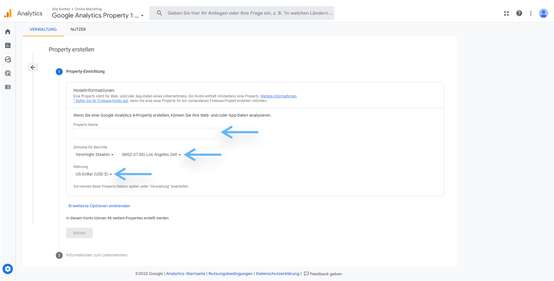 Benennen Sie die Property (Bsp. Firma + Land) und wählen Sie eine Zeitzone und die Währung aus. Beachten Sie, dass die Zeitzone und die Währung zum Land, in dem getrackt werden soll, passen muss.